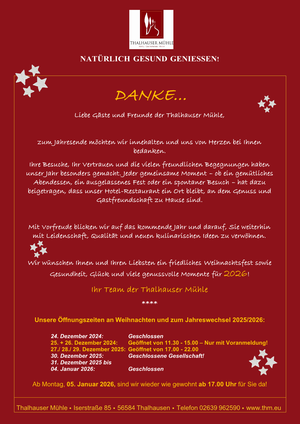 Gemäß dem weisen Spruch des Horaz "Wirklich glücklich ist, wer jeden Tag sagen kann: heute habe ich gelebt!" wünschen wir all unseren Gästen, einen angenehmen, entspannenden und genussreichen Aufenthalt in unserem Hotel und Restaurant "Thalhauser Mühle" in Thalhausen.
